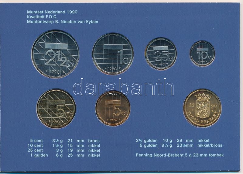 Hollandia 1990. 5c-5G (6xklf) + "Noord Brabant" emlékérem forgalmi sor karton dísztokban T:1 Netherlands 1990. 5 Cents - 5 Gulden (6xdiff) + "Noord Brabant" commemorative coin, coin set in cardboard case C:UNC