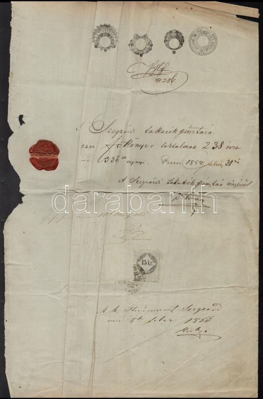 Beschreibung: 1854-63 okmány 20G, 3G, 15kr, 3kr magyar szignettával