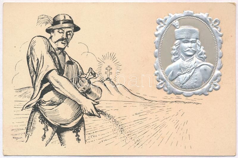 Magvető paraszt, irredenta művészlap. Szeiler féle Patent fémplaketten II. Rákóczi Ferenc. Szeiler József dombornyomása / Hungarian irredenta art postcard. Emb. metallic Francis II Rákóczi s: Zsolt (EK)