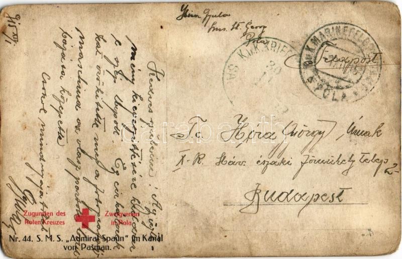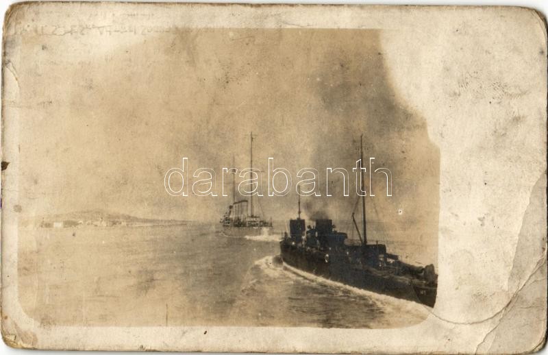 1915 SMS "Admiral Spaun" im Kanal von Pasman. Zugunsten des Roten Kreuzes Zweigverein in Pola. Nr. 44. / SMS Admiral Spaun az Osztrák-Magyar Haditengerészet gyorscirkálója / K.u.K. Kriegsmarine / WWI Austro-Hungarian Navy scout cruiser with SM Torpedoboot 52 T (ex Alligator) torpedo boat. photo (EB)