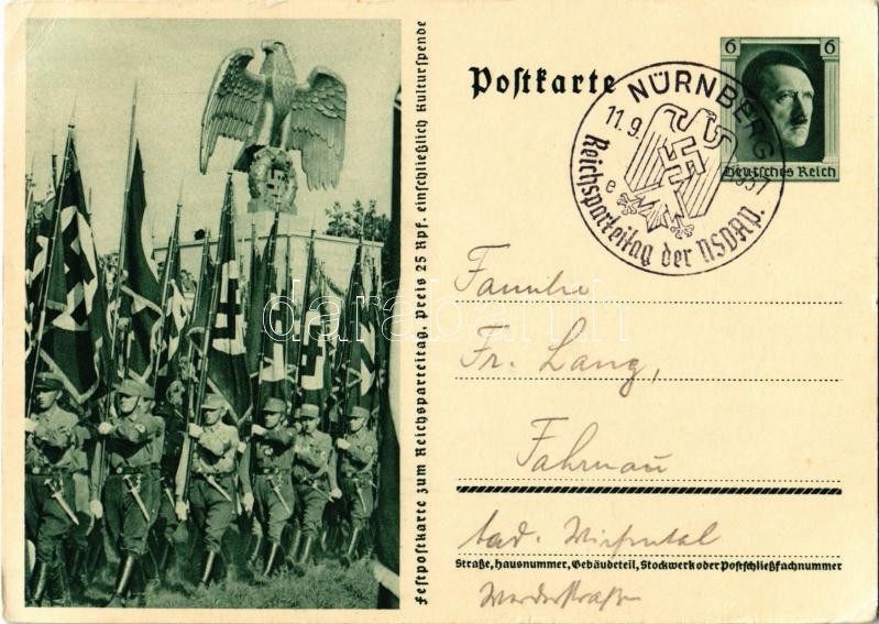 Beschreibung: Festpostkarte zum Reichsparteitag / NSDAP German Nazi Party propaganda, swastika; 6 Ga. Adolf Hitler + 1937 Reichsparteitag der NSDAP Nürnberg So. Stpl. (EK)