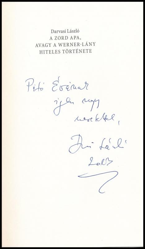 Darvasi László: A zord apa, avagy a Werner-lány hiteles története. Bp.,2012,Magvető. Fekete-fehér fotókkal illusztrált. Kiadói egészvászon-kötés. A szerző által dedikált.