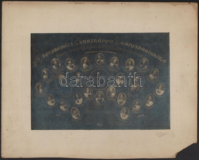 1926 Kecskemét, Szakirányú Leány Ipariskola tanárai és végzett növendékei, kistabló nevesített portrékkal, 15,5x22,5 cm, karton (sarka hiányos) 25,5x32 cm