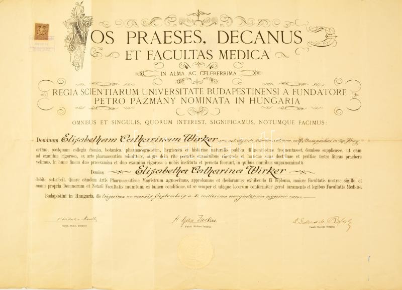 Beschreibung: 1929 Bp., Pázmány Péter Tudományegyetem Orvostudományi Kara által kiadott gyógyszerész diploma