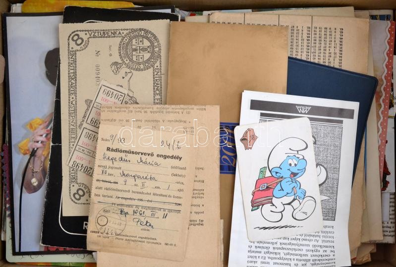 Beschreibung: Vegyes papírrégiség tétel: üdvözlőlapok, kisnyomtatványok, papírzacskók, stb., egy cipősdoboznyi érdekes anyag