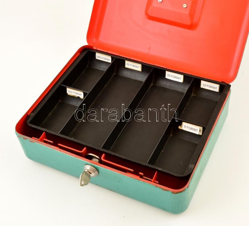 Beschreibung: Fém kassza kulccsal, aprótartóval, kopásnyomokkal, 29×24×10 cm