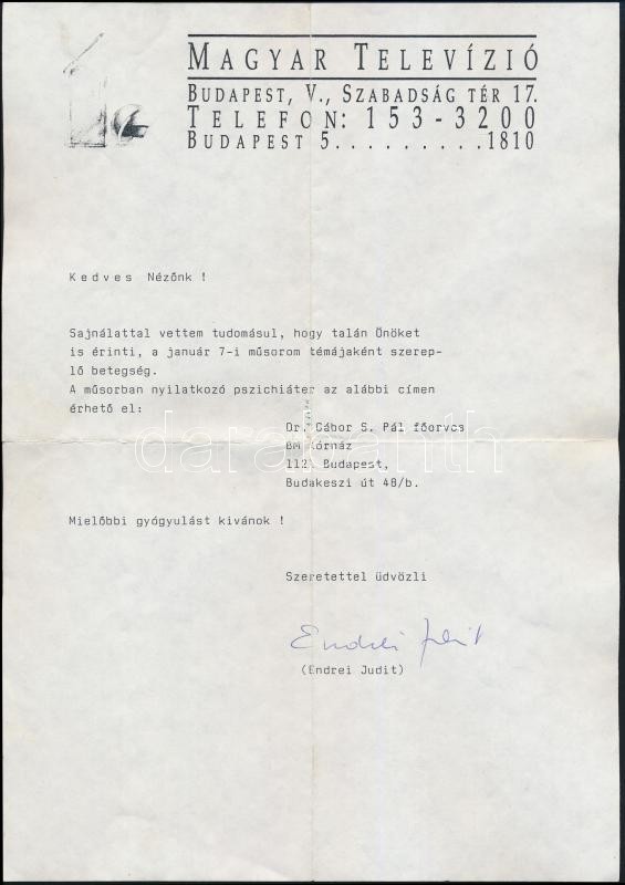 Endrei Judit (1953- ) műsorvezető-szerkesztő aláírása gépelt levélen, ... https://www.darabanth.com/de/351-Fernauktion/351.0/Kunst-Dokumente-andere-Sammelgebiete/Signatur~500019/Endrei-Judit-1953-musorvezeto-szerkeszto-alairasa-gepelt-levelen-MTV-fejleces-papiron~II1997710
