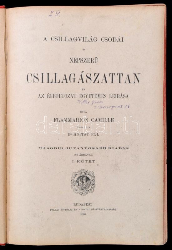 Flammarion Camille: Népszerű csillagászattan és az égboltozat egyetemes leírása I. kötet. Bp., 1888, Pallas. Második kiadás. Kiadói festett, aranyozott egészvászon kötés, festett lapélekkel, kissé kopott borítóval, szakadozott címlappal.