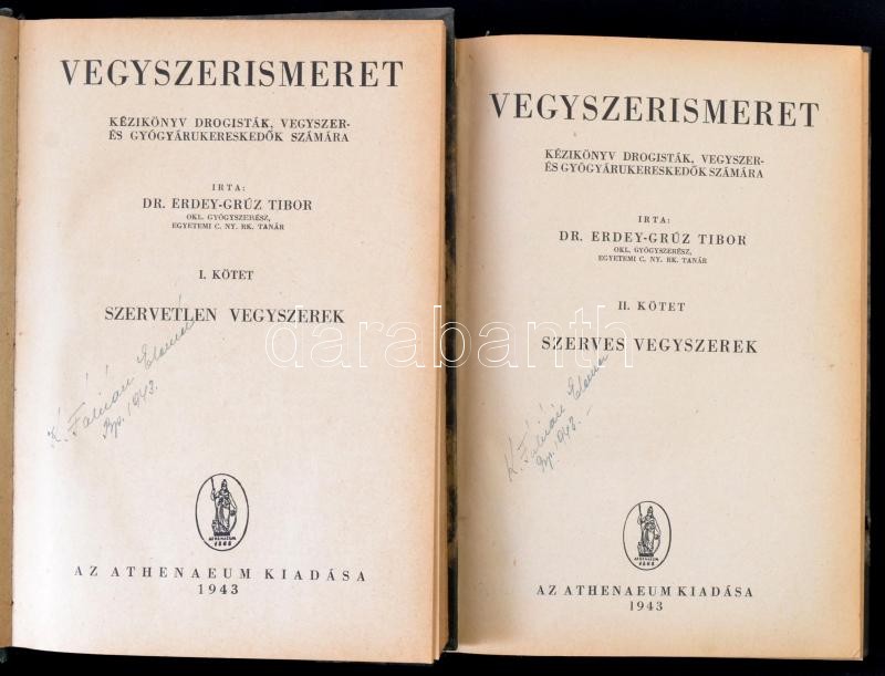 Dr. Erdey-Grúz Tibor: Vegyszerismeret I-II. Kézikönyv drogisták, vegyszer-és gyógyárukereskedők számára. I. kötet: Szervetlen vegyszerek. II. Szerves vegyszerek. Bp., 1943, Athenaeum. Átkötött modern félvászon-kötés. Jó állapotban.
