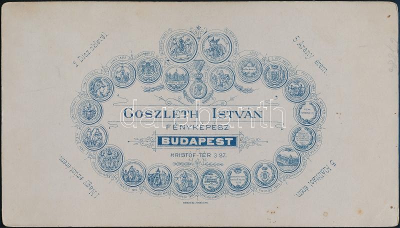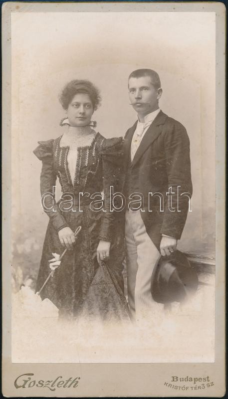 Beschreibung: cca 1900 Rhúz Gyula kir. törvényszéki tanácselnök és neje szentgyörgyvölgyi Magay Ida fotója, keményhátú fotó, Bp., Goszleth műterméből, 21x12 cm.