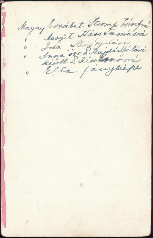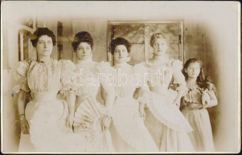 Beschreibung: cca 1900 Szentgyörgyvölgyi Magay leányok portréja, Magay Erzsébet, Magay Margit, Magay Ida, Magay Anna, Magay Ella, keményhátú fotó, a hátoldalon feliratozva, 13x21 cm.