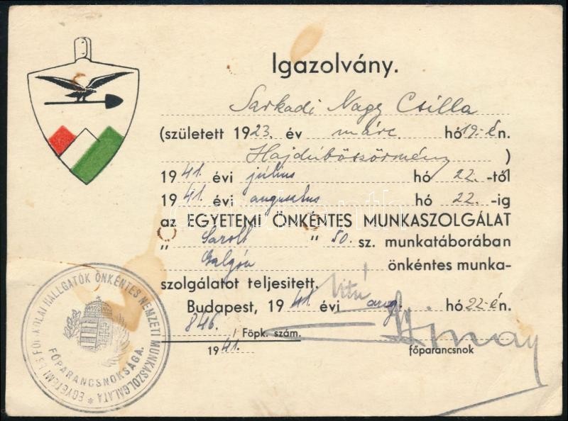 1941 Egyetemi Önkéntes Munkaszolgálat igazolványa. https://www.darabanth.com/de/352-Fernauktion/352.0/Kunst-Dokumente-andere-Sammelgebiete/Dokument~500017/1941-Egyetemi-Onkentes-Munkaszolgalat-igazolvanya~II2002711