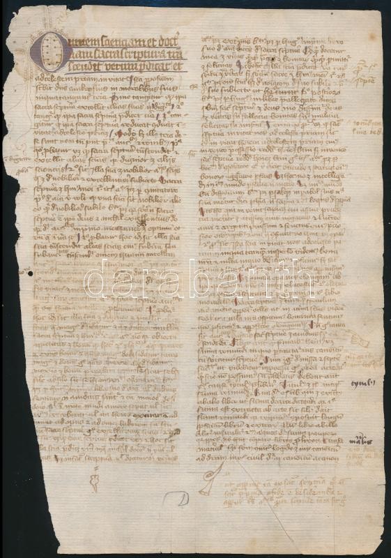 cca 1400-1500 Adam von Aldersbach (?-1260 k.) "Summula sacramentorum Raymundi de Pennaforte metrificata" című művének egy lapja ("Omenm scientiam et doctrinam Sacra Scriptura transcendit verum predicat et ad celestem patriam invitat" stb.), papír, a kötési oldala sérült, több kéztől származó lapszéli jegyzetekkel, rajzokkal, 2 p.