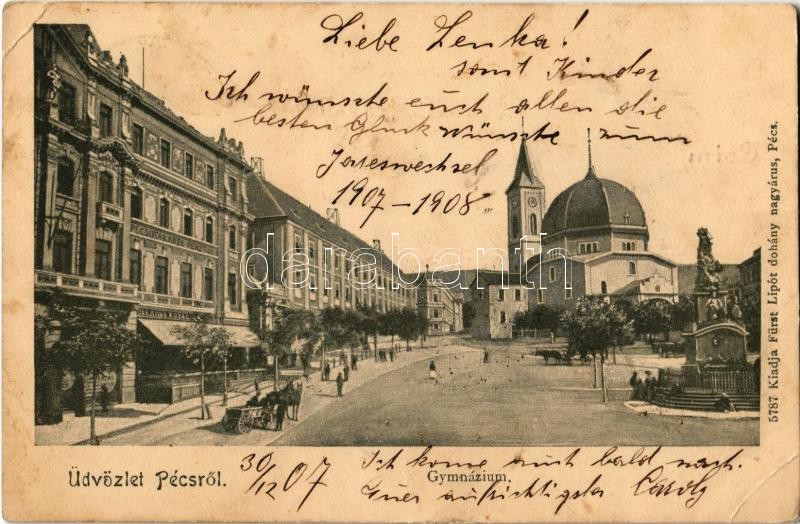1907 Pécs, Gimnázium, tér, takarékpénztár, üzletek (EK) https://www.darabanth.com/de/353-Fernauktion/353.0/Ansichtskarten/Ungarn~1000004/1907-Pecs-Gimnazium-ter-takarekpenztar-uzletek-EK~II2012201