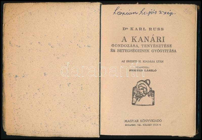 Dr. Karl Russ: A kanári gondozása, tenyésztése és betegségeinek gyógyítása. Bp., 1937, Magyar Könyvkiadó, 64 p. Kiadói papírkötésben, kissé kopott borítóval, kis gyűrődésekkel.