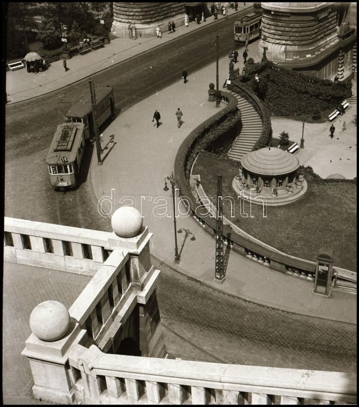 Beschreibung: cca 1933 Kinszki Imre (1901-1945) budapesti fotóművész hagyatékából vintage negatív (19-es villamos az Erzsébet híd budai hídfőjénél), 6x6 cm