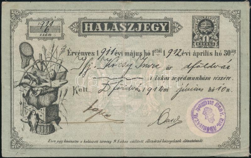 1911 Halászjegy III. tip / Fishing licence https://www.darabanth.com/de/353-Fernauktion/353.0/Kunst-Dokumente-andere-Sammelgebiete/Dokument~500017/1911-Halaszjegy-III-tip-Fishing-licence~II2013194