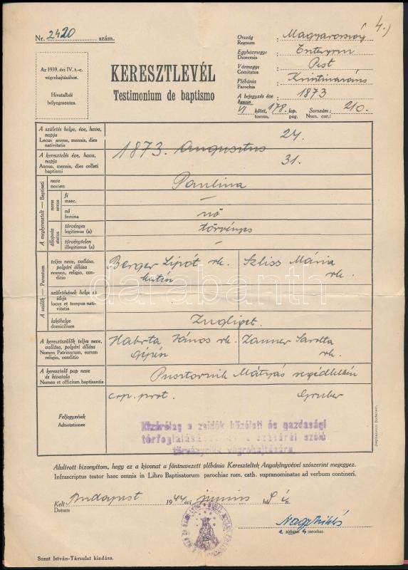 Beschreibung: 1944 Budapest, keresztlevél, zsidótörvény végrehajtására vonatkozó bélyegzéssel