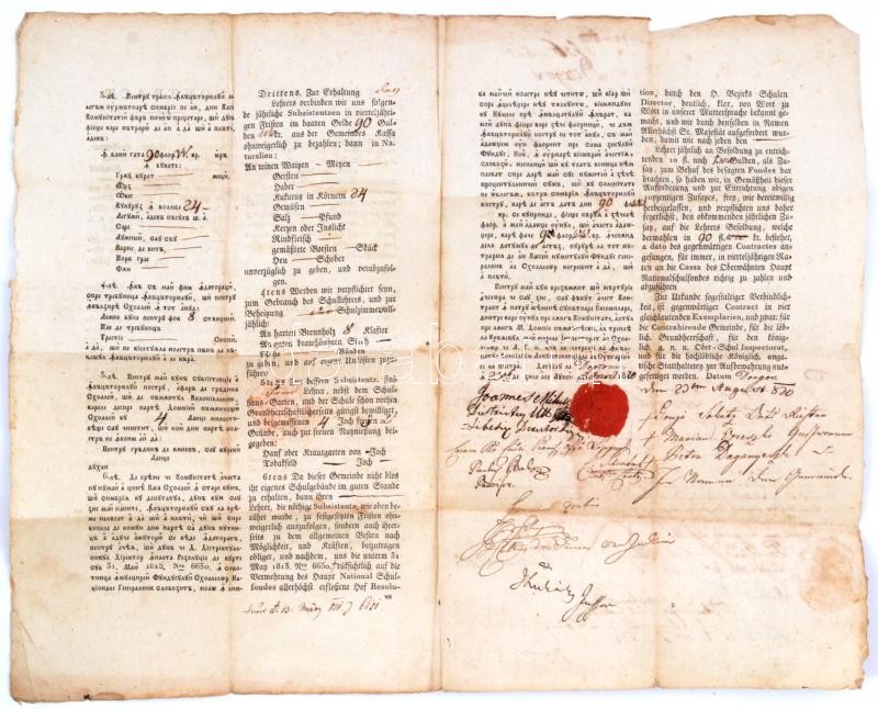 Beschreibung: 1820 Dorgos, Karánsebes megye tanítói munkaszerződés német és román nyelven, aláírásokkal, viaszpecséttel.