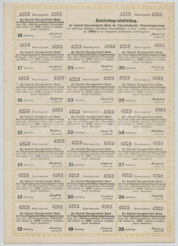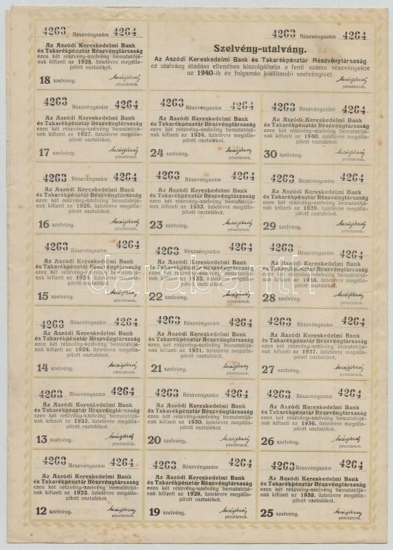 Aszód 1922. "Az Aszódi Kereskedelmi Bank és Takarékpénztár Részvé... https://www.darabanth.com/de/353-Fernauktion/353.0/Numismatik/Aktien-und-Tickets~1500005/Aszod-1922-Az-Aszodi-Kereskedelmi-Bank-es-Takarekpenztar-Reszvenytarsasag-ket-nevre-~II2014130