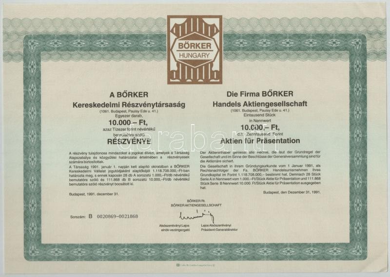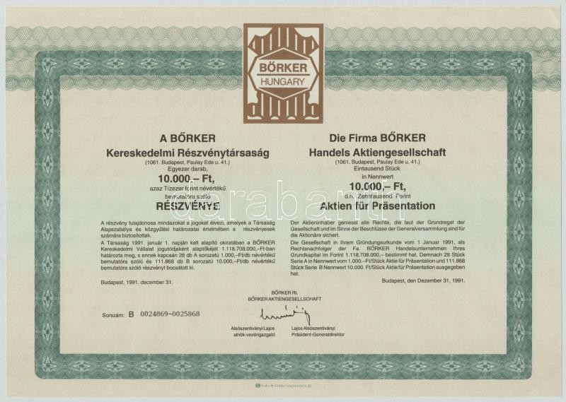 Budapest 1991. "A BŐRKER Kereskedelmi Részvénytársaság" bemutatóra szó... https://www.darabanth.com/de/353-Fernauktion/353.0/Numismatik/Aktien-und-Tickets~1500005/Budapest-1991-A-BORKER-Kereskedelmi-Reszvenytarsasag-bemutatora-szolo-reszvenye-10000F~II2014163