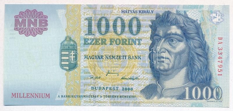 2000. 1000Ft "DA" "Millennium" T:I https://www.darabanth.com/de/353-Fernauktion/353.0/Numismatik/Ungarische-Banknoten~1500007/2000-1000Ft-DA-Millennium-TI~II2013210