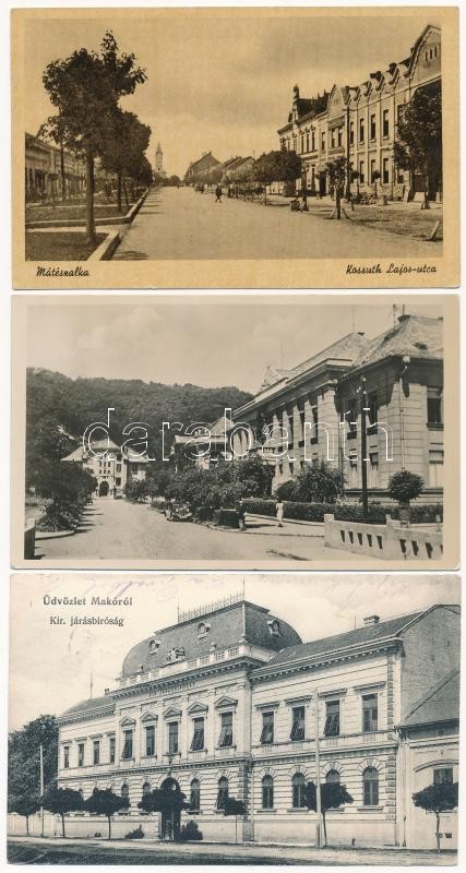 6 db főleg régi magyar városképes lap; járásbíróságok: Makó, Orosháza, Magyaróvár, Tiszalök, Salgótarján, Mátészalka / 6 mainly pre-1945 Hungarian town-view postcards with district courts