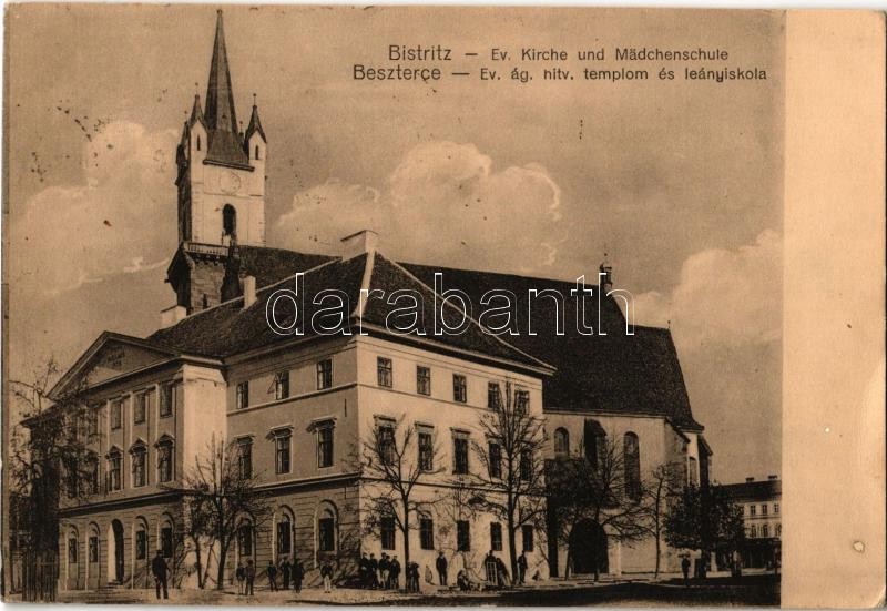 1922 Beszterce, Bistritz, Bistrita; Ev. Kirche und Mädchenschule / Evangélikus templom és lányiskola. Kiadja F. Stolzenberg / Lutheran church and girls' school (EK)
