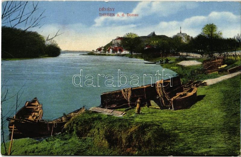 Dévény, Theben a. d. Donau, Devín (Pozsony, Bratislava); Duna-part csónakokkal, távolban a vár és az Árpád szobor, millenniumi emlékmű / Danube riverbank with boats, castle and millennium monument in the background