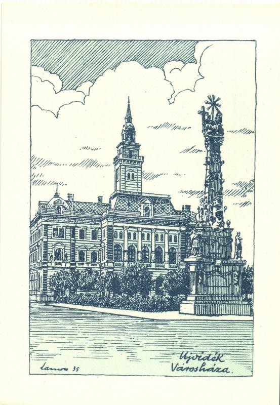 Újvidék, Novi Sad; Városháza. Kiadja a Délvidéki Egyetemi és Főiskolai Hallgatók Egyesülete / town hall, irredenta art postcard s: Lamoss - képeslapfüzetből / from postcard booklet