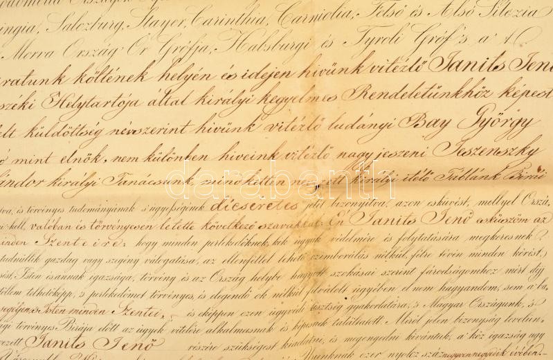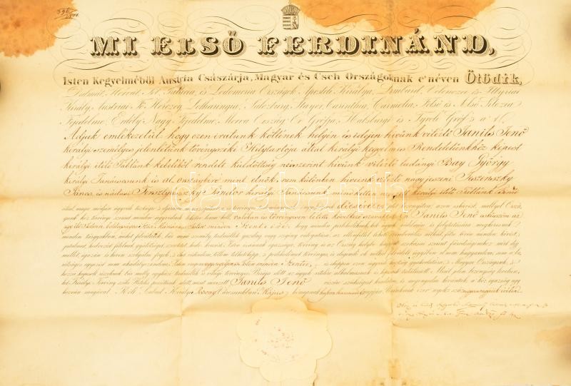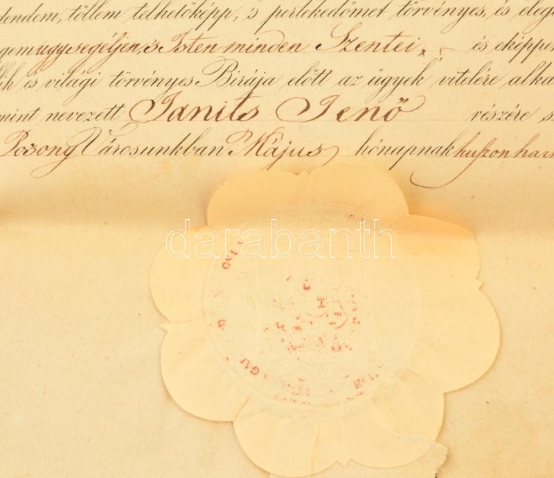 1844 Ügyvédi oklevél Janits Jenőy részére. Címeres, papírfelzetes vias... https://www.darabanth.com/de/354-Fernauktion/354.0/Kunst-Dokumente-andere-Sammelgebiete/Dokument~500018/1844-Ugyvedi-oklevel-Janits-Jenoy-reszere-Cimeres-papirfelzetes-viaszpecsettel-64x42-cm-F~II2008860