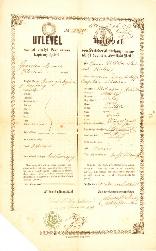 1850 Pest, Gerritsen Lőrinc Vilmos duna gőzhajózási kapitány részére szóló német-magyar nyelvű útlevél, Orsovába tartó utazás céljára, 1850. dec. 19., pecsétekkel, aláírással.