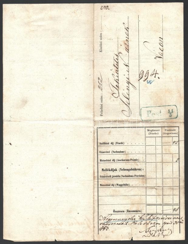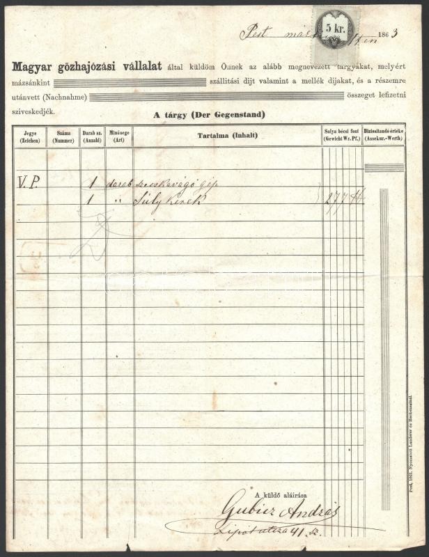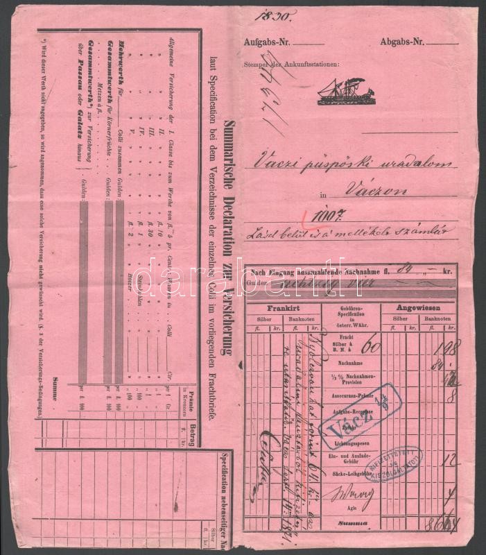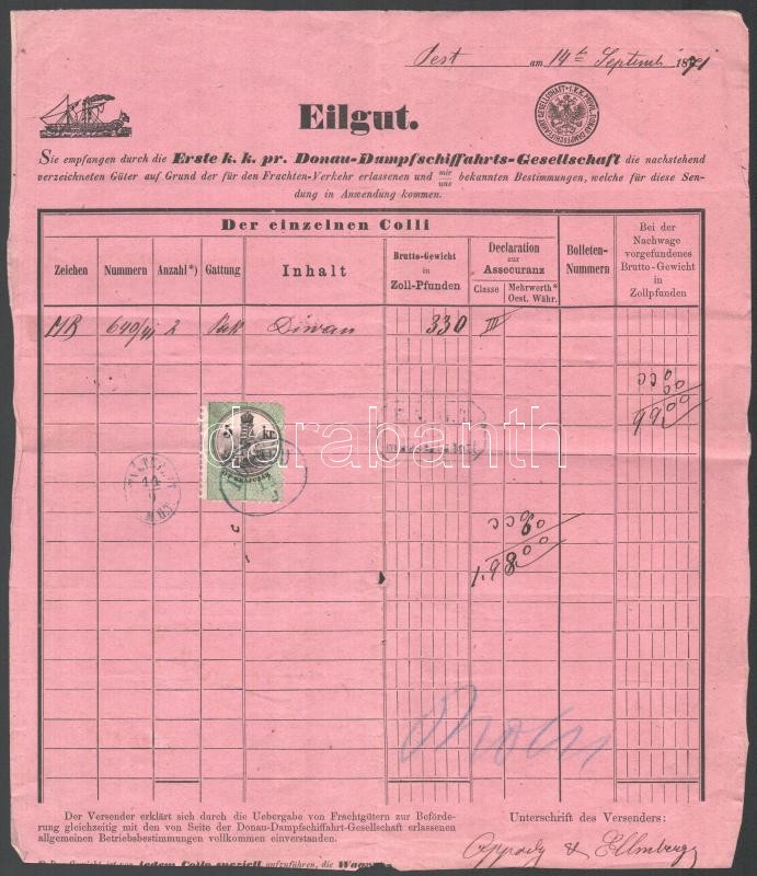 Beschreibung: 1863-71 Magyar Gőzhajózási Vállalat és Első cs. kir. Dunagőzhajózási Társulat hajós fuvarlevele hajópecséttel