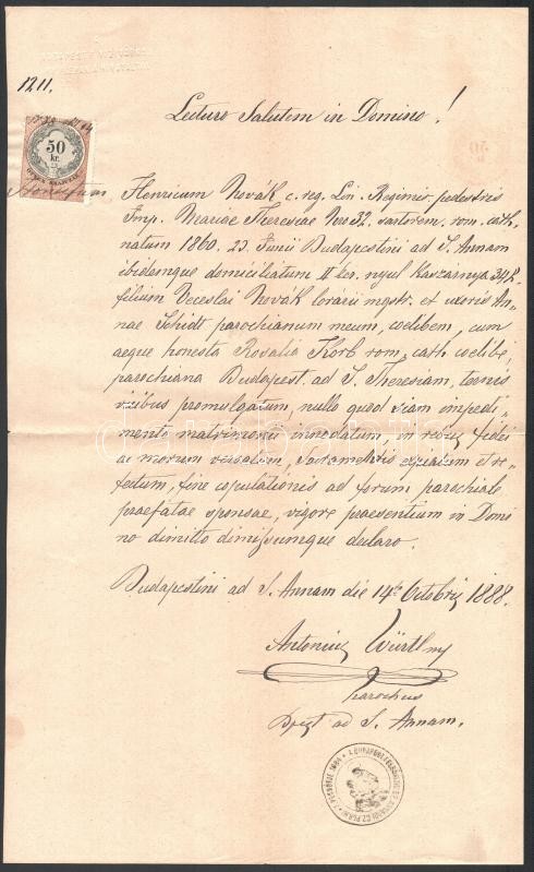 Beschreibung: 1888 Bp., a vízivárosi plébánia latin nyelvű házasodási engedélye, okmánybélyeggel