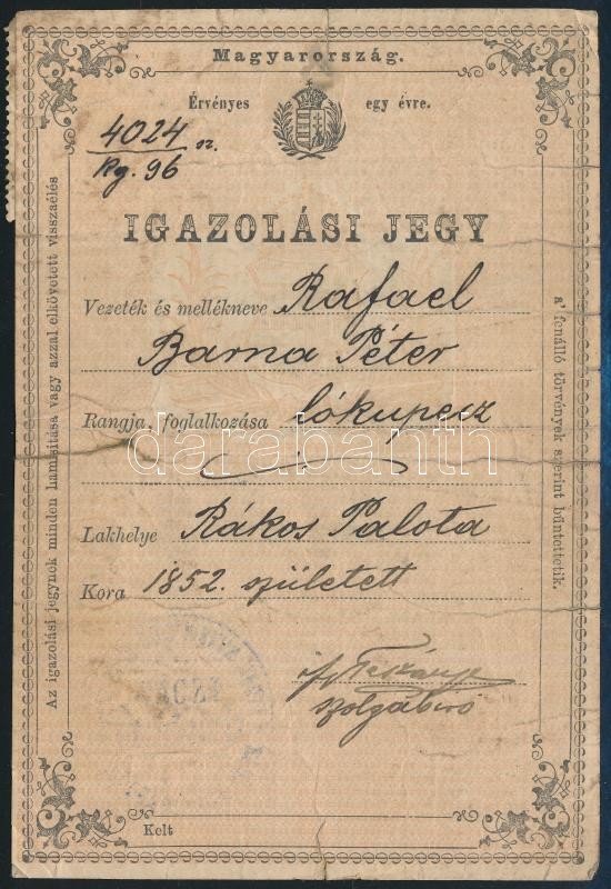 1896 Igazolási jegy lókupec részére https://www.darabanth.com/de/354-Fernauktion/354.0/Kunst-Dokumente-andere-Sammelgebiete/Dokument~500018/1896-Igazolasi-jegy-lokupec-reszere~II2023965