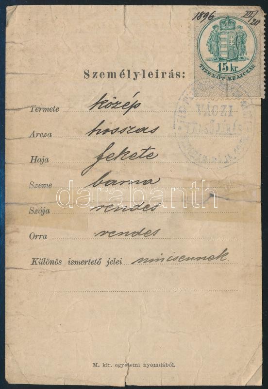 Beschreibung: 1896 Igazolási jegy lókupec részére