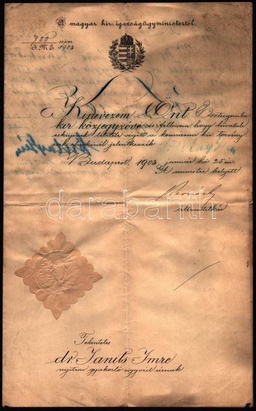 1903 Közjegyzői kinevezés dr. Janits Imre, a közjegyzői kamara későbbi... https://www.darabanth.com/de/354-Fernauktion/354.0/Kunst-Dokumente-andere-Sammelgebiete/Dokument~500018/1903-Kozjegyzoi-kinevezes-dr-Janits-Imre-a-kozjegyzoi-kamara-kesobbi-elnokenek-reszere~II2008893