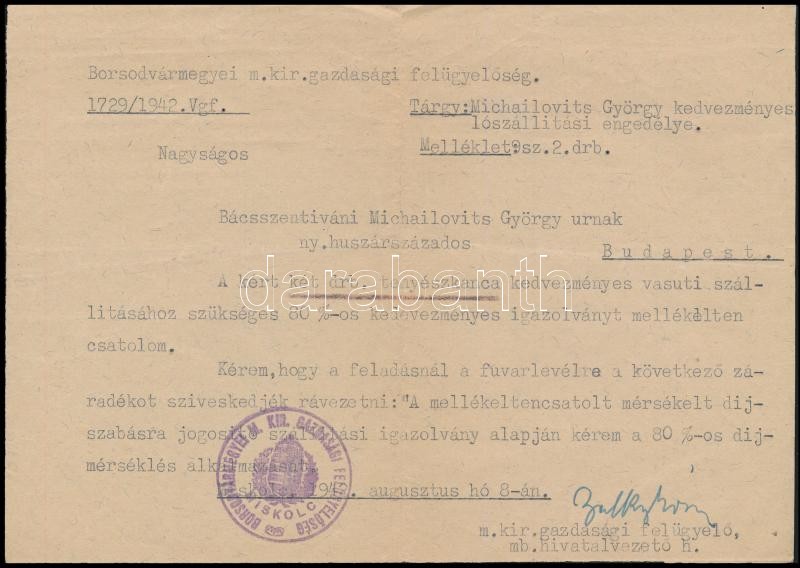 1942 a Borsodvármegyei M. Kir. Gazdasági Felügyelőség lószállítási eng... https://www.darabanth.com/de/354-Fernauktion/354.0/Kunst-Dokumente-andere-Sammelgebiete/Dokument~500018/1942-a-Borsodvarmegyei-M-Kir-Gazdasagi-Felugyeloseg-loszallitasi-engedelye-bacsszentivC3~II2017792
