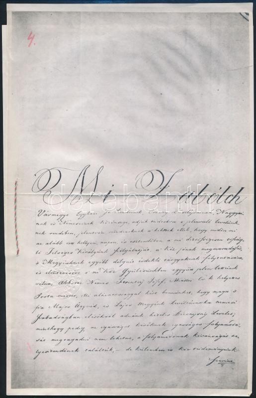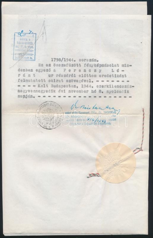 1944 Szabolcs vármegye közgyűlésének 1841. évi nemességmegerősítési okleveléről készült hiteles másolat, Somogyi Béla budapesti közjegyző hitelesítési záradékával