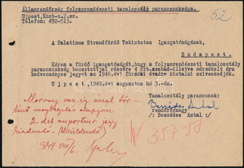 1948 Bp., az Államrendőrség folyamrendészeti tanalosztály parancsnokságának gépelt levele a Palatinus Strandfürdő igazgatósága részére 4 db szabadjegy igénylése ügyében, Beszédes Antal rendőrőrnagy aláírásával, későbbi feljegyzéssel