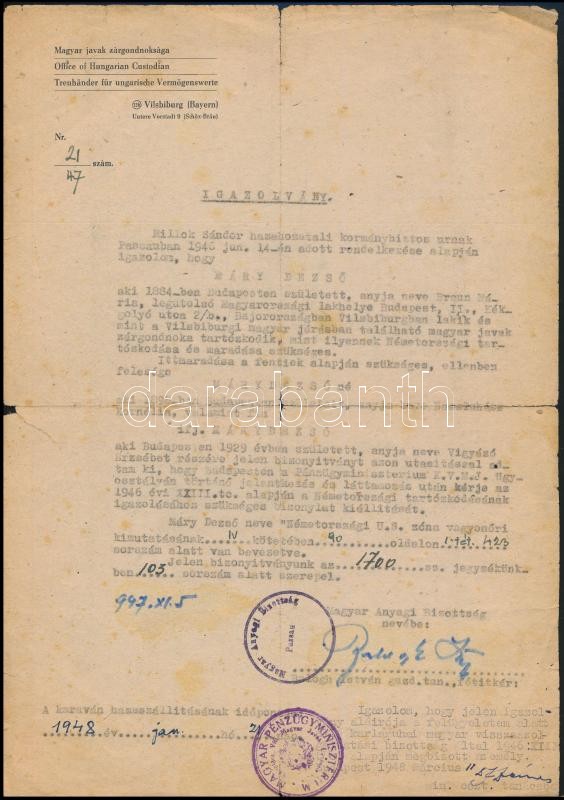 1948 a Magyar Javak Zárgondnoksága igazolása Máry Dezső zárgondnok ném... https://www.darabanth.com/de/354-Fernauktion/354.0/Kunst-Dokumente-andere-Sammelgebiete/Dokument~500018/1948-a-Magyar-Javak-Zargondnoksaga-igazolasa-Mary-Dezso-zargondnok-nemetorszagi-tartozkoda~II2017637