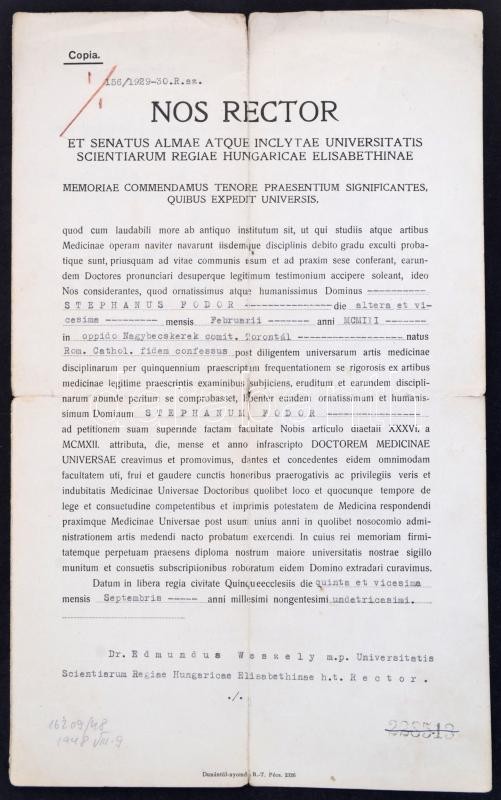 cca 1929 Az Erzsébet Tudományegyetem latin nyelvű orvosi oklevelének hiteles másolata + Budapest főváros hatósági egészségügyi személyzetének lakjegyzéke