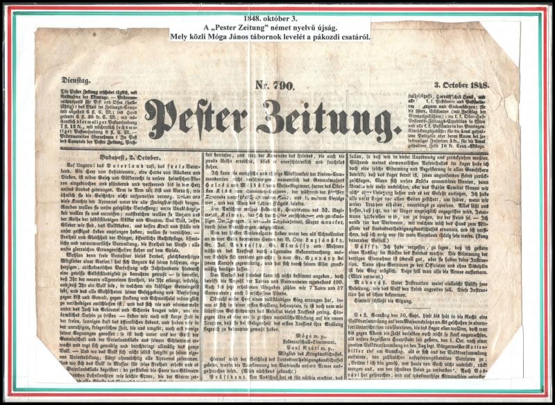 1848 Pester Zeitung. 1848. okt. 3., Nr. 790. Benne Móga János (1784-1861) tábornok írásával a pákozdi csatáról. Pest, Landerer és Heckenast-ny., a szélén hiánnyal, hajtásnyommal, kis foltokkal, 4075-4076 p.