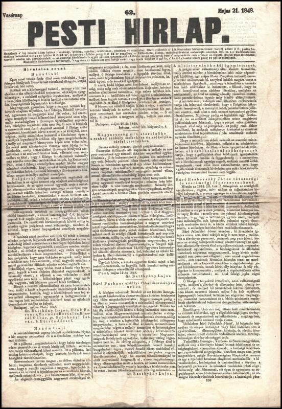 1848 Pesti Hírlap. 1848. máj. 21. 62 sz. Szerk.: Csengeri Antal-Kemény Zsigmond. Pest, Landerer Lajos-ny., hajtásnyomokkal, 461-464 p. Benne a kor híreivel, és korabeli hirdetésekkel.