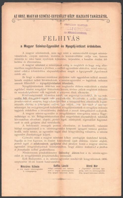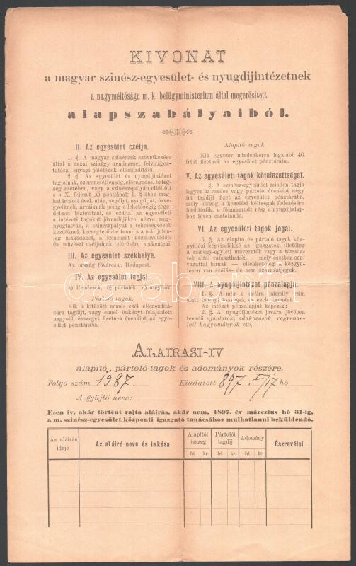 1897 Magyar színész egyesület és nyugdíj intézel alapszabályai kivonat... https://www.darabanth.com/de/354-Fernauktion/354.0/Kunst-Dokumente-andere-Sammelgebiete/Drucksachen~500030/1897-Magyar-szinesz-egyesulet-es-nyugdij-intezel-alapszabalyai-kivonat~II2023814