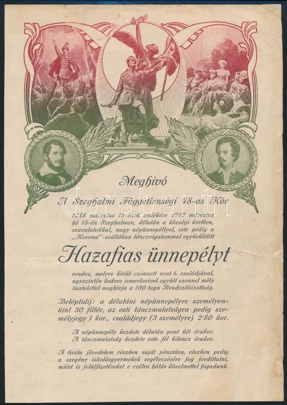 1913 Szeghalom, Szeghalmi Függetlenségi 48-as Kör hazafias népünnepély... https://www.darabanth.com/de/354-Fernauktion/354.0/Kunst-Dokumente-andere-Sammelgebiete/Drucksachen~500030/1913-Szeghalom-Szeghalmi-Fuggetlensegi-48-as-Kor-hazafias-nepunnepely-meghivoja-1913-maj~II2019980