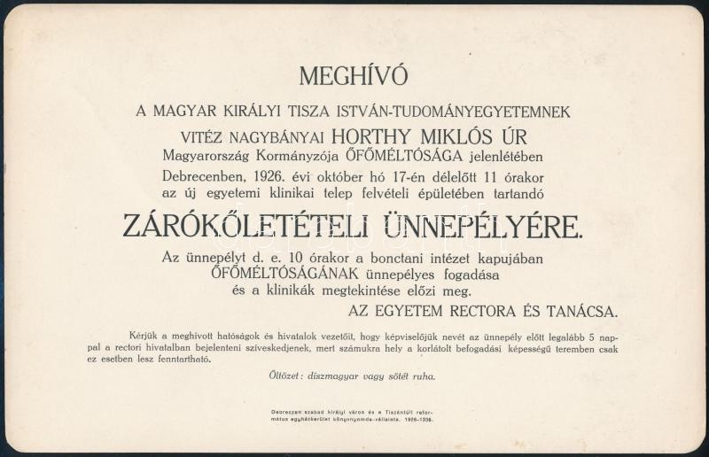 1926 Debrecen, Meghívó a Magyar Királyi Tisza István Tudományegyetem H... https://www.darabanth.com/de/354-Fernauktion/354.0/Kunst-Dokumente-andere-Sammelgebiete/Drucksachen~500030/1926-Debrecen-Meghivo-a-Magyar-Kiralyi-Tisza-Istvan-Tudomanyegyetem-Horthy-Miklos-jelenlete~II2021718