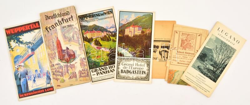 Vegyes német nyelvű idegenforgalmi prospektus tétel, 7 db, Wuppertal, Frankfurt am Main, Semmering bei Wien, Badgestein, Lugano, közte egy München és egy Potsdam térképpel. Változó állapotban.
