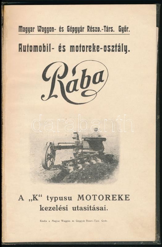 cca 1910-1920 Rába. A "K" typusu motoreke kezelési utasításai. Győr, Magyar Waggon- és Gépgyár Rt. Automobil- és motoreke-osztály,(Győr, László Izsó-ny.), 39+1 p. Szövegközti illusztrációkkal. Aranyozott egészvászon-kötés, sérült gerinncel, az egyik lapon (5/6.) az illusztrációt visszaragasztották.