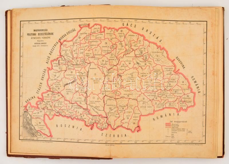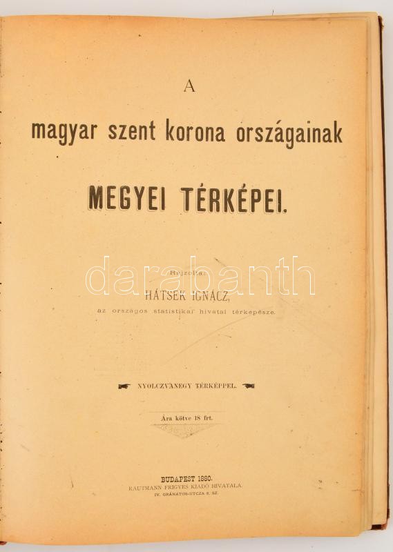 1880 Hátsek Ignác: A magyar szent korona országainak megyei térképei. Rajzolta: - -. Bp.,1880, Rautmann Frigyes, (Bp. Metszette és nyomta Posner Károly Lajos-ny.), , 4 p. + 1 (átnézeti térkép)+80 t. (térképek.) Nyolcvanegy kétszÃnű litografált térkép tábla, 1: 500.000. Kiadói egészvászon-kötés, javÃtott gerinccel, borÃtó szélén kopott. Egy lap: Baranya hiánnyal.